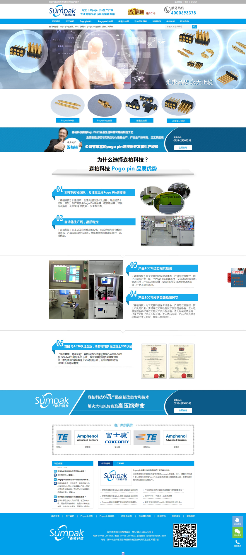 Project Description 深圳市森柏科技有限公司是专注高端pogo pin连接器、探针、弹簧针的制造厂家,森柏科技拥有Pogo Pin行业最先进和最可靠的制造工艺,主要制造过程均实现自动化设备生产,产品生产效率高,加工精度高,重要检测过程均采用自动化快速识别系统,大大降低了人为操作失误的风险,极大的提升了检测效率,工艺过程得到极大的改善和满足。因此产品质量和稳定性获得巨大突破。 Official website address 东营http://www.zgsumpak.com I want to share